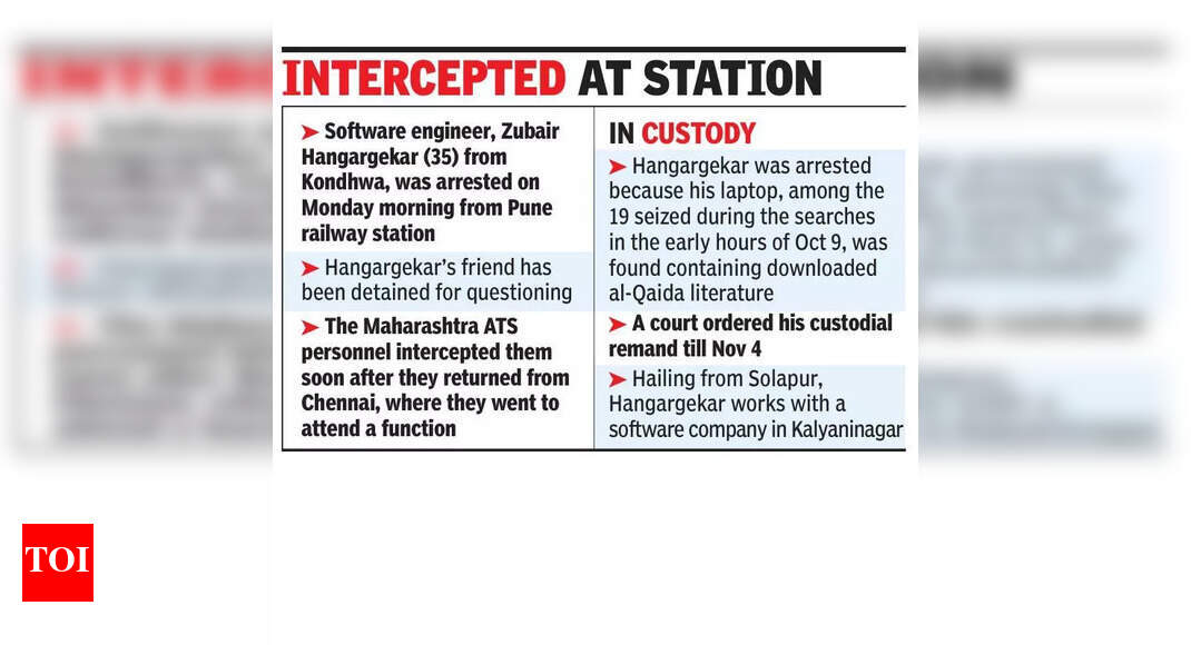 पुणे: महाराष्ट्र दहशतवाद विरोधी पथकाने (एटीएस) सोमवारी सकाळी कोंढवा येथून जुबेर हंगरगेकर (३५) या सॉफ्टवेअर अभियंत्याला अल-कायदा या प्रतिबंधित दहशतवादी संघटनेचे साहित्य बाळगल्याच्या आरोपावरून अटक केली. दोघे चेन्नईहून परतल्यानंतर एटीएसने हंगरगेकर यांच्या मित्राला पुणे रेल्वे स्थानकावर चौकशीसाठी ताब्यात घेतले. ते एका कार्यक्रमात सहभागी होण्यासाठी गेले होते.“आम्ही हंगरगेकरला अटक केली कारण 9 ऑक्टोबरच्या पहाटे जप्त केलेल्या 19 लॅपटॉपपैकी त्याच्या लॅपटॉपमध्ये अल-कायदाचे डाउनलोड केलेले साहित्य सापडले. असे साहित्य डाउनलोड करणे हा गुन्हा आहे,” असे एटीएस अधिकाऱ्याने नाव जाहीर न करण्याच्या इच्छेने TOI ला सांगितले.19 लॅपटॉप व्यतिरिक्त, एटीएसने 9 ऑक्टोबर रोजी शहरातील अनेक ठिकाणी केलेल्या झडतीदरम्यान 40 सेलफोन जप्त केले होते. ही गॅजेट्स डिजिटल फॉरेन्सिक विश्लेषणासाठी पाठवण्यात आली होती, असे अधिकाऱ्याने सांगितले. एटीएसच्या पथकाने सोमवारी सायंकाळी हंगरगेकर यांना शहर न्यायालयात हजर केले. त्याला ४ नोव्हेंबरपर्यंत कोठडीत ठेवण्याचे आदेश दिले आहेत. अधिकाऱ्याने सांगितले की, हंगरगेकर यांनी अभियांत्रिकी पदवी घेतली आहे आणि ते सॉफ्टवेअर चाचणी आणि डेटाबेस डेव्हलपमेंटमध्ये होते. मूळचे सोलापूरचे असलेले हंगरगेकर हे कल्याणीनगर येथील एका सॉफ्टवेअर कंपनीत कामाला आहेत. तो विवाहित असून त्याला दोन मुले आहेत. त्याचा भाऊ आणि कुटुंबातील इतर सदस्य जवळच्याच सोसायटीत राहतात.“आम्ही हंगरगेकर अल-कायदाच्या सदस्यांच्या संपर्कात आला होता का आणि त्याच्याशी काय संबंध ठेवायचा होता याचा तपास करत आहोत. तसेच, त्याच्याकडे अल-कायदाचे सर्व साहित्य का होते. आम्ही त्याच्या ताब्यात घेतलेल्या मित्राची चौकशी करू आणि त्याचा सेलफोन आणि इतर इलेक्ट्रॉनिक गॅझेट तपासू. तो इतर कोणत्याही दहशतवादी संघटनेच्या संपर्कात आला आहे का, हेही आम्ही तपासत आहोत, असे एटीएसच्या वरिष्ठ अधिकाऱ्याने सांगितले.एटीएसने या महिन्याच्या सुरुवातीला मागील ISIS मॉड्यूल प्रकरणाच्या चालू तपासाच्या संदर्भात शोध घेतला आणि ते संशयित कट्टरपंथी लोकांवर केंद्रित होते. त्यावेळी १९ जणांना ताब्यात घेण्यात आले. चौकशीनंतर त्यांना सोडून देण्यात आले. अधिकाऱ्यांनी इलेक्ट्रॉनिक गॅझेट्सशिवाय कागदपत्रे जप्त केली.