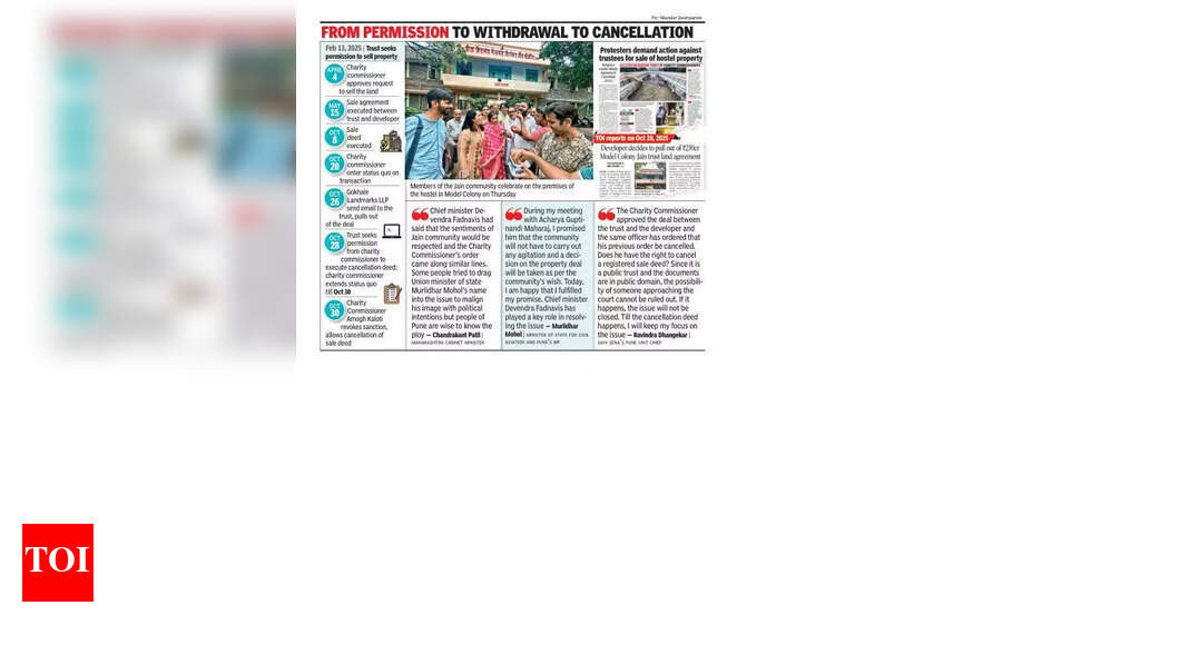 पुणे: महाराष्ट्र राज्य धर्मादाय आयुक्त अमोघ कलोती यांनी गुरुवारी मॉडेल कॉलनीतील सेठ हिराचंद नेमचंद स्मारक ट्रस्टच्या मालकीच्या 3.5 एकर मालमत्तेच्या पुनर्विकासाची 4 एप्रिल 2025 रोजीची मंजुरी रद्द करण्याचा आदेश काढला. या आदेशाने विश्वस्त आणि गोखले लँडमार्क्स एलएलपी यांना विक्री डीड आणि पॉवर ऑफ ॲटर्नी रद्द करण्याची परवानगी दिली. कलोती यांनी ट्रस्टला विक्री करार रद्द झाल्यानंतर विकासकाला 230 कोटी रुपये परत करण्याचे निर्देश दिले. जैन समुदायाने ट्रस्टच्या निर्णयावर आक्षेप घेतल्यानंतर हा करार वादात सापडला आणि दोन आठवडे आंदोलने झाली. आवारात वसतिगृह आणि जैन मंदिर/प्रार्थना हॉल आहे.करार रद्द न झाल्यास जैन धर्मगुरू आचार्य गुप्तीनंदी महाराज यांनी 1 नोव्हेंबरपासून बेमुदत उपोषणाला बसण्याच्या आवाहनादरम्यान, ट्रस्ट आणि विकासक या दोघांनीही धर्मादाय आयुक्तांना करारातून माघार घेण्याचे त्यांचे इरादे कळवले.त्यांच्या प्रतिज्ञापत्रांच्या आधारे, कलोती यांनी आदेश जारी केला, त्यांना विक्री करार रद्द करण्याची प्रक्रिया सुरू करण्याची परवानगी दिली. “महाराष्ट्र सार्वजनिक न्यास अधिनियमाच्या कलम 36 (2) अंतर्गत अधिकार वापरताना, 4 एप्रिल 2025 रोजी मंजूर केलेला आदेश याद्वारे रद्द करण्यात आला आहे,” असे आदेशात म्हटले आहे.धर्मादाय आयुक्तांनी ट्रस्ट आणि विकासकाला लवकरात लवकर विक्री डीड आणि पॉवर ऑफ ॲटर्नी रद्द करण्यासाठी पावले उचलण्यास सांगितले. ट्रस्टला विक्री मोबदल्याची संपूर्ण रक्कम विकसकाला परत करण्याचे निर्देश देण्यात आले होते, जे अंदाजे 230 कोटी रुपये आहे.आंदोलन सुरू ठेवणाऱ्या जैन समाजाच्या सदस्यांनी समाधान व्यक्त केले. माजी विद्यार्थी आणि आंदोलक अक्षय जैन यांनी TOI ला सांगितले, “हा केवळ जैन समाजाचाच नाही तर पुण्यातील लोकांचाही विजय आहे ज्यांनी आम्हाला पाठिंबा दिला. हा एक ऐतिहासिक आदेश मानला जाईल ज्यामुळे लोकांना सार्वजनिक ट्रस्टच्या जमिनीचे रक्षण करण्यात मदत होईल. हा एक कठीण लढा होता, परंतु आम्हाला आनंद आहे की न्याय मिळाला आणि आम्ही ट्रस्टची मालमत्ता वाचवू शकलो.“माजी खासदार राजू शेट्टी आणि एमव्हीए सदस्यांसह विरोधकांनी, शिवसेना पुणे युनिटचे प्रमुख रवींद्र धंगेकर यांच्यासह केंद्रीय नागरी विमान वाहतूक राज्यमंत्री आणि पुण्याचे खासदार मुरलीधर मोहोळ आणि विकासक विशाल गोखले हे व्यावसायिक भागीदार असल्याने या करारात सहभागी असल्याचा आरोप केला होता. या आठवड्याच्या सुरुवातीला मोहोळ यांनी ट्रस्टच्या वसतिगृहात आचार्य गुप्तीनंदी महाराज यांची भेट घेतली.या आदेशानंतर धर्मगुरू म्हणाले, “हा संपूर्ण समाजाच्या ऐक्याचा विजय आहे. जे काही घडले ते आता भूतकाळात आहे आणि आपण सर