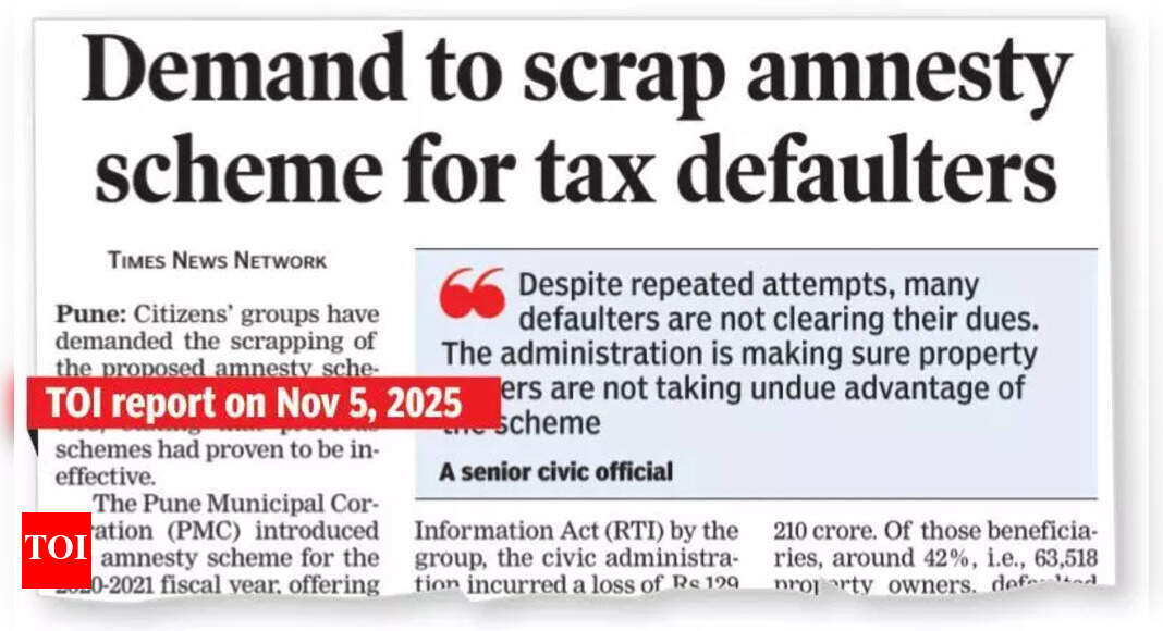पुणे : नागरी संस्थेने मालमत्ता कर माफी योजनेचा लाभ घेण्यापासून पुन्हा थकबाकीदार असलेल्या १.३८ लाख मालमत्तांच्या मालकांना बंदी घालण्याचा निर्णय घेतला आहे.काही मालमत्ताधारक दरवर्षी त्यांच्या कराची थकबाकी करत आहेत आणि कर्जमाफी योजनेचा अवाजवी फायदा घेत आहेत, असा नागरिकांच्या गटांनी आक्षेप घेतल्यानंतर पुणे महानगरपालिकेने (पीएमसी) हा निर्णय घेतला.या योजनेअंतर्गत, प्रशासनाने प्रलंबित मालमत्ता कराच्या दंडावर 75% सूट देऊ केली.पीएमसीच्या मालमत्ता कर विभागाचे प्रमुख रवी पवार म्हणाले, “केवळ खऱ्या लाभार्थ्यांनाच योजनांचा लाभ मिळावा यासाठी पावले उचलली जात आहेत. मालमत्ताधारकांना वारंवार लाभ मिळू दिला जाणार नाही. याआधीच या योजनेत सहभागी झालेल्या सर्वांना पुन्हा भाग घेण्याची परवानगी दिली जाणार नाही,” असे पीएमसीच्या मालमत्ता कर विभागाचे प्रमुख रवी पवार यांनी सांगितले.“एकाहून अधिक कर्जमाफी योजना महापालिकेच्या आर्थिक शिस्तीसाठी चांगल्या नाहीत. त्यामुळे मेहनती करदात्यांना चुकीचा संदेश जातो,” असे सजग नागरिक मंचचे विवेक वेलणकर यांनी सांगितले.पीएमसी डेटा दर्शविते की सुमारे 13,097.11 कोटी रुपयांच्या थकबाकीसह कर थकबाकीदारांकडून वसूल केला जाणार आहे. यामध्ये 3,635.62 कोटी रुपयांचा मूळ कर आणि 9,461.49 कोटी रुपयांचा दंड समाविष्ट आहे. नागरी प्रशासनाने गेल्या आठवड्यात मालमत्ता कर थकबाकीदारांसाठी माफी योजना जाहीर केली, जी 15 नोव्हेंबरपासून लागू होणार आहे.“मासिक आकारल्या जाणाऱ्या 2% चक्रवाढ व्याज सारखी दंडाची रक्कम मूळ कराच्या रकमेपेक्षा जास्त असल्याने, 15 नोव्हेंबर 2025 ते पुढील वर्षी 15 जानेवारी या कालावधीत माफी योजना लागू केली जात आहे. ती दंडाच्या रकमेवर 75% सूट देईल,” प्रशासनाने त्यांच्या प्रस्तावात म्हटले आहे.महाराष्ट्र महानगरपालिका अधिनियमानुसार, मालमत्ता कर वेळेवर न भरल्यास विहित मुदतीनंतर 2% मासिक दंड आकारण्याची तरतूद करण्यात आली आहे. योजनेच्या प्रस्तावानुसार, थकबाकीदार मालमत्तेवर 2% मासिक दंडासह मालमत्ता कराची थकबाकी खूप जास्त आहे.